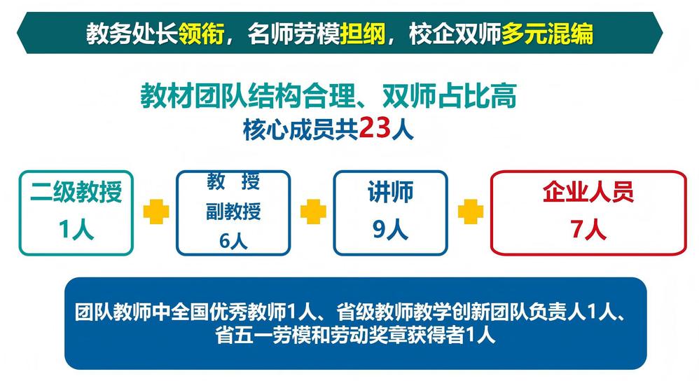 教材编写团队共由23名校企人员组成,包含江浙、贵州等高职和职业本科教师16人(高级职称7人),以及天士力药业等企业人员7人(高级工程师3人),其中全国优秀教师1人、省五一劳模和劳动奖章获得者1人;第一主编为省“药品生产技术”专业群、“生物制药技术”教学创新团队、“药品智能制造”虚仿基地负责人,主持国家在线精品课程“药物分析技术”。