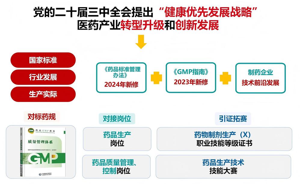 习近平总书记指出,要用“最严谨的标准、最严格的监管、最严厉的处罚、最严肃的问责”要求确保药品质量安全。教材以服务党的二十届三中全会提出的“健康优先发展战略”为目标,遵循我国最新药品法律法规,面向药品生产各环节,依据药品生产岗位职业能力要求,参照国家专业教学标准,融入“生命至上、质量为先”医药文化,将企业GMP实施与职业教育教学充分融合编制而成。