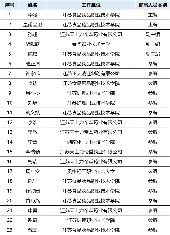 双师结构合理,由23名校企人员组成,含江浙、贵州等高职和职业本科教师16人(高级职称7人),均为“双师型”教师,以及天士力、正大等制药企业人员7人。